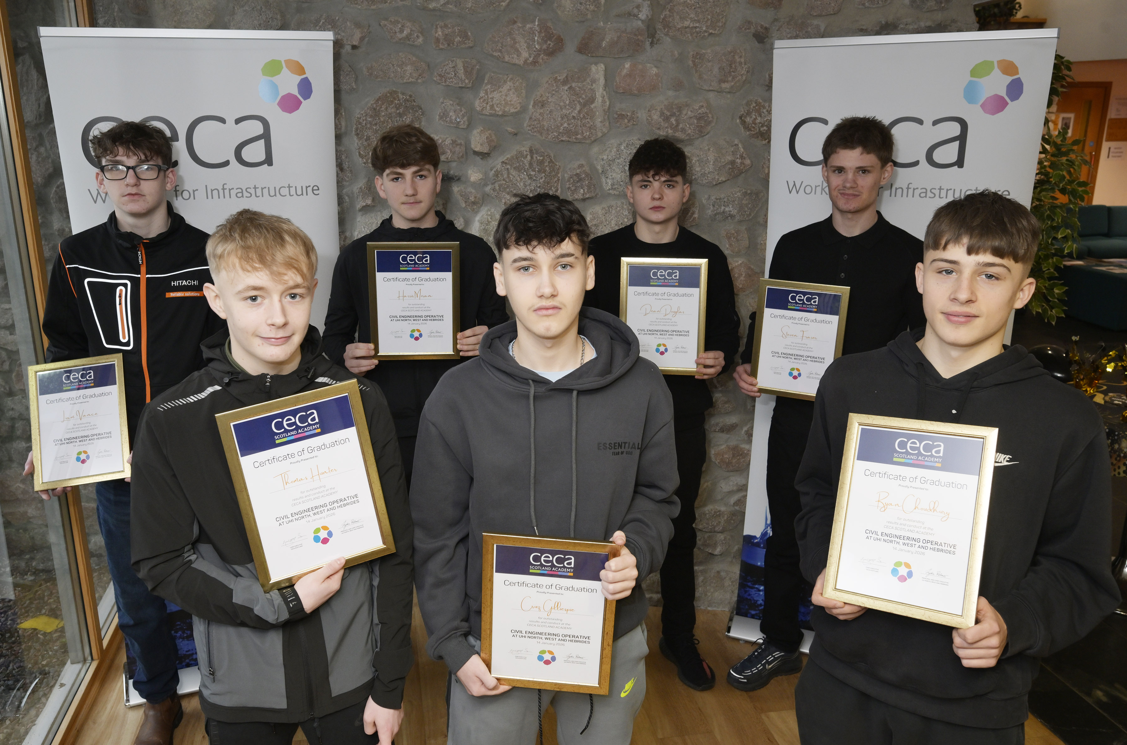 A graduation ceremony was held at UHI North, West and Hebrides’ Fort William campus on Wednesday, January 14th, to celebrate the second group of students to complete the CECA Scotland Academy Civil Engineering Operative course. Following the success of its first year, the course continues to provide a direct pathway into employment within the industry. UHI North, West and Hebrides is one of six CECA Scotland Academy college partners in Scotland.